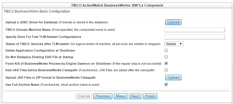 The TIBCO BusinessWorks Basic Configuration page allows for definition of the JDBC driver, setting a specific TIBCO Domain machine name (the TIBCO Logical Machine name - TLM), provides for specification of Fast TLM Restart, and allows uploading of external jar files and prepending/appending the path in the Classpath.