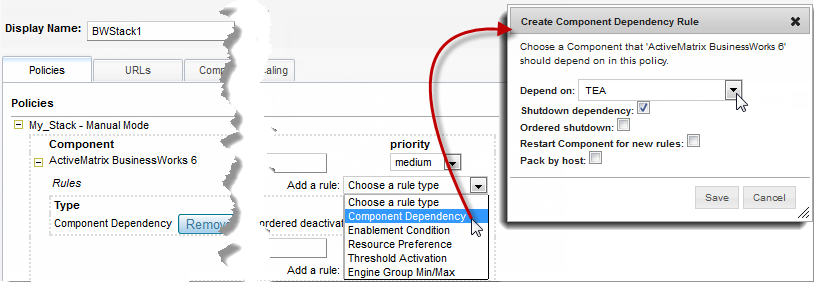 - Set a component dependency on ActiveMatrix BusinessWorks client components using the same Add a rule drop down menu to set dependence on the single instance of a ActiveMatrix BusinessWorks server component in your stack.
