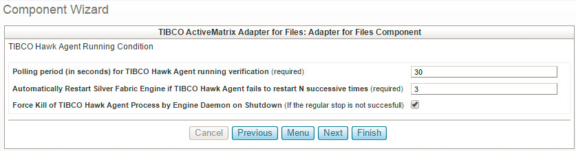 - Polling Period (in seconds) for detection of TIBCO Hawk Agent running verification (required)