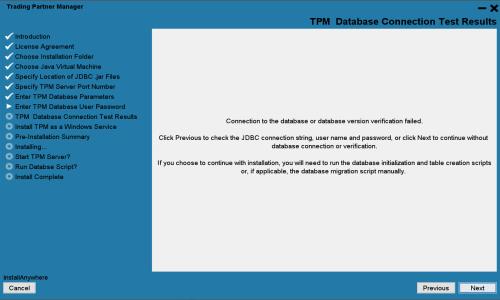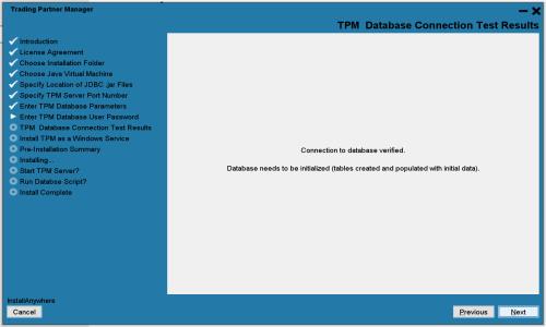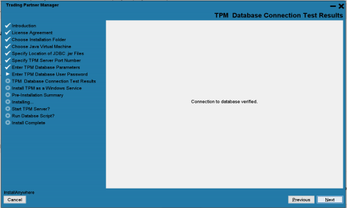 The TPM Database Connection Test Results screen displays, which shows the results of the database connection test, as shown in the following image.