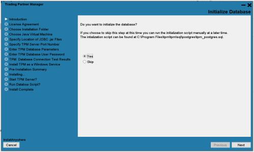 Select Yes to initialize the database and create the tables now, or Skip to create the tables manually after the installation completes. For more information, see Using SQL Scripts.