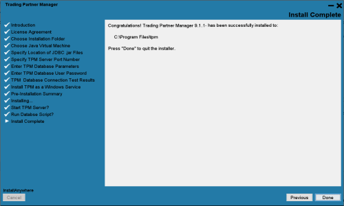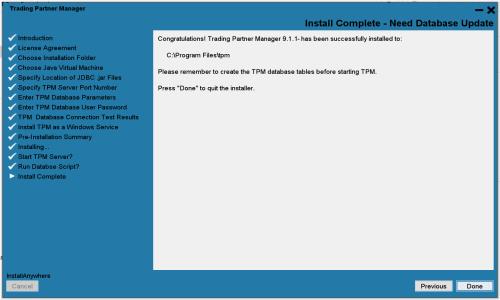 Note: Run the database scripts to create tables before starting iWay TPM. - Click Done.