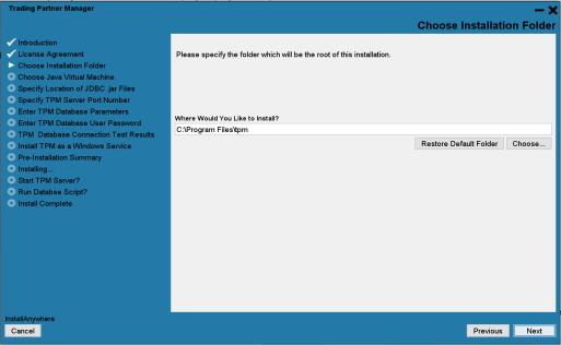 The Choose Installation Folder screen displays. You can keep the default folder location as C:\Program Files\tpm, as shown in the following image, or choose any other location.