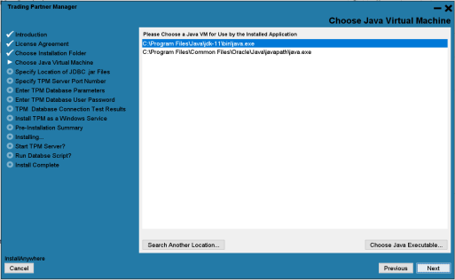 The Choose Java Virtual Machine screen displays, as shown in the following image.