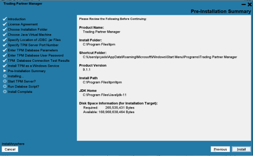 - Review the installation summary and click Install if all the information is correct. If you want to change any value, click Previous to return to the appropriate screen.