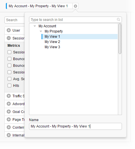 Par défaut, le nom de cette table de données est constitué des noms du compte, de la propriété et de la vue sélectionnés. Dans cet exemple, le nom de la table de données sera My Account - My Property - My View 1. Pour modifier le nom de la table de données, cliquez sur l’icône des paramètres située à côté du nom Dans la fenêtre indépendante, vous pouvez modifier la vue depuis laquelle les données sont chargées et renommer la table de données.