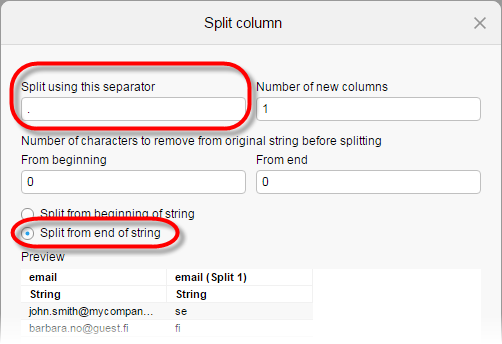Si vous êtes intéressé par les codes de pays, vous pouvez directement utiliser le séparateur « . » pour effectuer la division. Vous pouvez ensuite définir le Nombre de nouvelles colonnes sur « 1 » et sélectionner Diviser depuis la fin de la chaîne pour obtenir les codes de pays uniquement dans une nouvelle colonne.