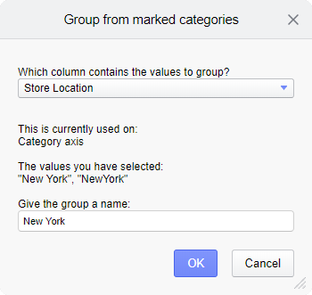 Pour corriger cette erreur, marquez les barres correspondantes, cliquez avec le bouton droit sur la visualisation, puis sélectionnez Regrouper à partir des catégories marquées. Dans la boîte de dialogue ouverte, attribuez au nouveau groupe contenant les deux valeurs un nom correct.