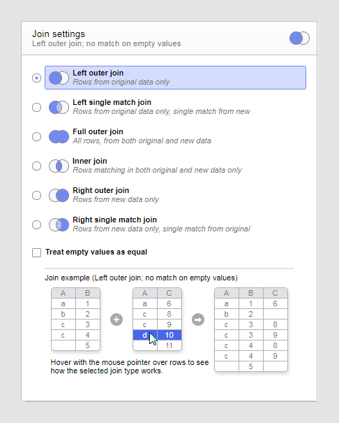그러면 추가된 컬럼에 대한 설정 대화 상자가 열립니다. 조인 설정 섹션을 검사하고 대화형 조인 예제를 시도한 결과 현재 선택된 조인 유형인 왼쪽 외부 조인이 현재 사용 사례에 적합하지 않다는 결론을 내렸습니다. 왼쪽 외부 조인의 경우 두 번째 데이터 테이블에서만 사용 가능한 행은 결과 데이터 테이블에 포함되지 않습니다.