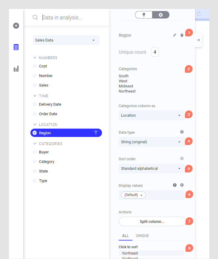 5. Кроме того, можно изменить такие параметры, как порядок сортировки или форматирование столбца. Можно также обрабатывать пустые значения в столбце. Предпочтительный метод агрегирования (для числовых данных) также может улучшить рекомендации и ускорить работу со столбцом в визуализациях. Доступные категории зависят от типа столбца.