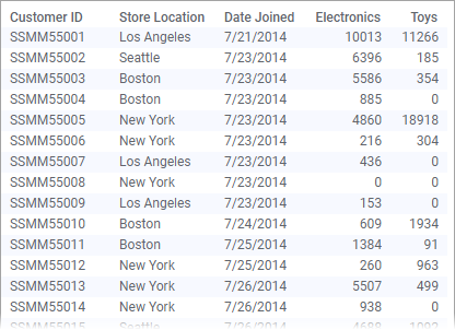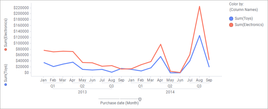JavaScript must be enabled in order to use this site.Please enable JavaScript in your browser and refresh the page. 创建折线图 折线图用于显示趋势,大多数情况下用于显示随时间推移的趋势。还可以用于识别某些模式。 折线图中的主轴是 X 轴和 Y 轴。要显示随时间推移的趋势,请在 X 轴上选择一个时间列。对于 X 轴上的每个数据点,系统会放置 Y 轴值。这些值可以表示特定数据点的聚合数据或非聚合数据。例如,聚合值可以是总和或平均。为了绘制“完整”线条,随后将在这些值之间绘制直线。 折线图可以包含一条或多条线。如果要比较多个数据列,或者要比较单个列中的不同类别,可以添加多条线。 根据要显示的内容或加载的数据的组织方式,以不同方式将线条添加到折线图中。 比较数据列 过程 在编写栏上,单击“图表类型”以打开浮出控件。 将折线图图表类型拖动到分析页面上的所需位置。 将提供折线图的建议。 在 X 轴上,选择应比较其值的时间列或任何其他列。 时间列中的值自动按时间顺序排序。要以层级方式显示时间数据,请参见指定时间层级。 在 Y 轴上,选择要显示为单独线条的列。 系统将使用不同的颜色为每个列绘制一条线。图例中的颜色轴设置为“(列名称)”。 对于每个选定的列,选择要显示的聚合值类型。 示例 假设您加载下面的数据。这些数据包含某个时间段顾客在不同门店的电子产品购买金额和玩具购买金额。 下面显示了比较电子产品部门购买金额总和与玩具部门购买金额总和所需进行的设置。 比较列中的类别 过程 在编写栏上,单击“图表类型”以打开浮出控件。 将折线图图表类型拖动到分析页面上的所需位置。 将提供折线图的建议。 在 X 轴上,选择应比较其值的时间列或任何其他列。 时间列中的值自动按时间顺序排序。 在 Y 轴上,选择要显示其值的列。 对于选定的列,选择要显示的聚合值类型。 在图例中的颜色轴上,指定包含要显示为单独线条的类别的列。 示例 您加载以上示例中显示的数据。下面显示了比较在不同门店的玩具购买金额总和所需进行的设置。 Copyright © Cloud Software Group, Inc. All rights reserved.