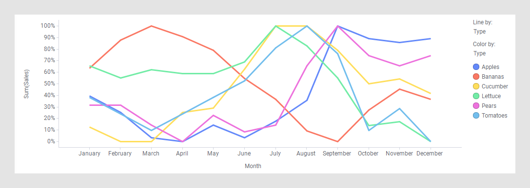 在下面的示例中,规范化折线用于呈现销售模式。