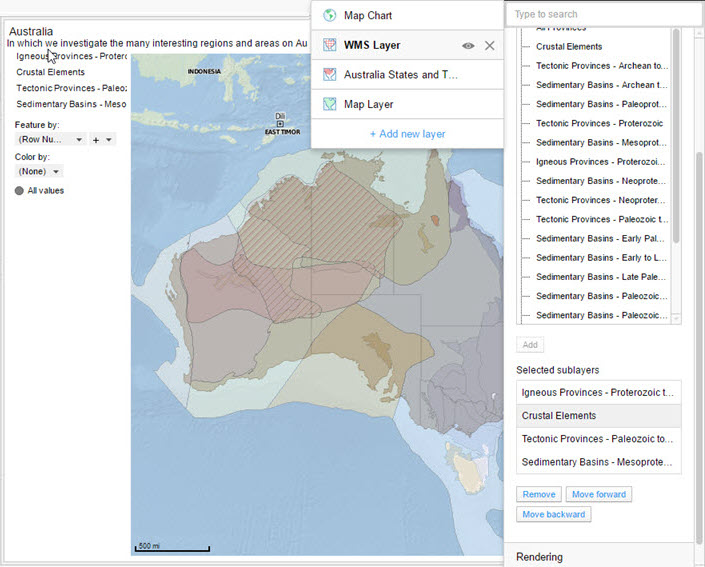 提示: 某些子图层可能会完全掩盖其他图层或子图层。要显示多个子图层,可考虑添加同一 WMS 图层的多个版本,并将“外观”属性更改为更高的透明度。