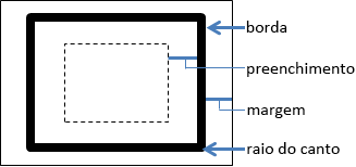 O conteúdo atual em um objeto é cercado por uma borda. Nessa área com borda, você pode especificar o preenchimento, isto é, a largura do espaço em cada lado do conteúdo. Você também pode definir as cores e as larguras da borda, bem como os raios de canto. As margens de outros objetos na interface do usuário também podem ser especificadas.