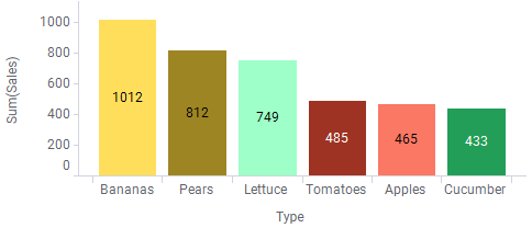 O gráfico de barras, exibindo a soma das vendas para os diferentes tipos, mostra que as vendas de banana são as maiores.