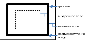 Фактическое содержимое объекта окружено границами. Внутри окруженной границами области можно настроить внутренние поля, то есть ширину пространства с каждой стороны содержимого. Кроме того, можно настроить цвета и ширину границы, а также радиус закругления ее углов. Также можно настроить расстояние к другим объектам пользовательского интерфейса.
