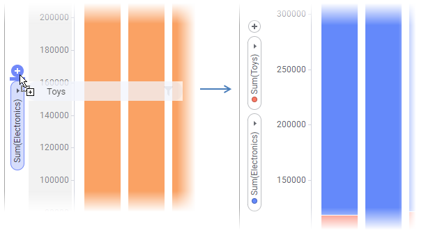 JavaScript must be enabled in order to use this site.Please enable JavaScript in your browser and refresh the page. 在轴上选择列 创建图表时,可以选择要在各个轴(例如 X 轴、Y 轴和颜色轴)上显示的数据列。 将鼠标指针悬停在图表上时,将沿着轴显示列选择器(例如 ),其中显示当前列。要切换到其他列,或者将更多列添加到轴上,可以使用“分析中的数据”浮出控件或仅使用列选择器。 使用分析中的数据浮出控件选择列 过程 如果“分析中的数据”浮出控件不可见,请单击编写栏上的“分析中的数据”。 在浮出控件中,找到要可视化的列并将其拖动到相关的列选择器中。 或者,也可以将列拖动到图表中,其中显示分别表示各个轴的不同放置目标。将列放置到所需的轴上。 要在轴上显示多个列,请在浮出控件中选择另一列,然后将其拖动到列选择器旁边的加号上。 注: 将显示新的加号,以允许添加更多列。如果添加到轴上的列超过三个,则不再显示每个列的名称,而仅显示列数。 使用列选择器选择列 过程 在列选择器中,单击列名称旁边的箭头。 此时将打开一个弹出窗口,其中列出数据表中的所有列。根据轴的类型和列数据的类型,弹出窗口的外观可能与如下所示稍有不同。 在弹出窗口中选择列。 注: 如果适用,还可以选择聚合方法。 如果要在轴上显示多个列,请单击列选择器旁边的加号,然后选择感兴趣的列。 结果与上面使用“分析中的数据”浮出控件获取的结果类似。提示: 在弹出窗口底部的字段中,可以为轴指定自定义显示名称。 单击弹出窗口外部的任意位置可将其关闭。 注: 如果添加到轴上的列超过三个,则不再显示每个列的名称,而仅显示列数。 Copyright © Cloud Software Group, Inc. All rights reserved.