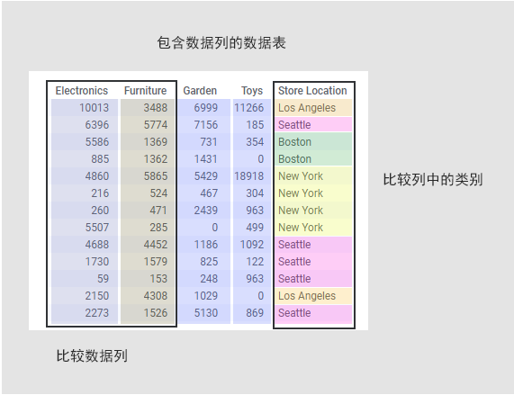 您可能想要比较数据中的列(如上所述),或者可能想要比较列中的不同类别(如下所示)。