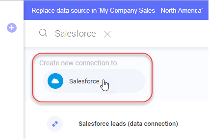 Во всплывающем окне Файлы и данные выберите новые данные, создав подключение или используя предопределенное подключение к новому источнику данных (Salesforce), выполнив поиск необходимых данных после входа в систему. Дополнительные сведения см. в разделе Создание анализа на основе данных Salesforce.