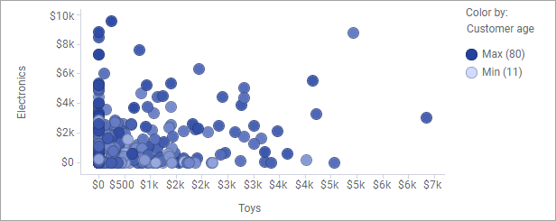 En el siguiente gráfico de dispersión, los indicadores representan la cantidad de dinero que gasta cada cliente en los departamentos de electrónica y de juguetes de una tienda. El degradado de color del indicador sirve para representar la edad de los clientes.