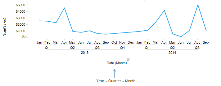 Para obtener una vista más detallada de los mismos datos puede seleccionar una jerarquía con más niveles, por ejemplo: año, trimestre y mes. Este control deslizante también presenta un nivel medio de jerarquía.
