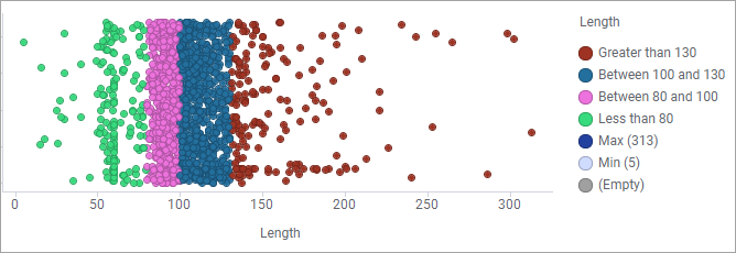 Se pueden asignar colores que difieran del resto. Por ejemplo, puede que quiera utilizar un color determinado para poner de relieve los elementos de mayor valor o los valores con caracteres iniciales idénticos, o que quiera aplicar un color diferente a elementos en un determinado intervalo. Para hacerlo, especifique reglas que contengan condiciones para la aplicación de colores. En lugar de seguir el resto del patrón de colores, los elementos que coinciden con la condición recibirán un color según la regla. Se pueden agregar varias reglas de color a una visualización.