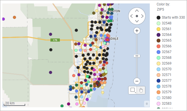 Se ofrecen diferentes posibilidades de asignación de colores en función de si la columna seleccionada en el eje Color por contiene valores por categorías o valores numéricos. Los valores por categorías son valores que se pueden dividir en grupos (como sexo o país) y los valores numéricos son datos cuantitativos (como distancias o cifras de ventas).