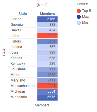 Por último, puede aplicar colores a los elementos de la visualización mediante un esquema de color predefinido. La disponibilidad de los esquemas de color predefinidos puede ser diferente según el tipo de valores de datos en la columna. Algunos de los esquemas de color tienen reglas de color incorporadas. Puede usar el esquema de color predefinido directamente, o bien usarlo como punto de partida para aplicar sus propios ajustes.