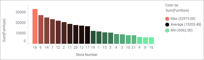 En el eje Color por de la visualización, seleccione la columna en función de cuyos valores se asignarán colores a los elementos. La columna puede ser cualquiera de las columnas seleccionadas en cualquier eje de la visualización, o bien puede ser una columna totalmente diferente. Las opciones de asignación de colores dependen de si la columna seleccionada contiene valores por categorías o valores numéricos.