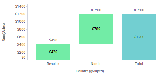 ウォーターフォール チャートの中間合計バーは、通常、特定のレベルのカテゴリを階層的に編成されたデータ内で要約します。また、中間合計バーがどのカテゴリを表現するかをカスタマイズすることができます。