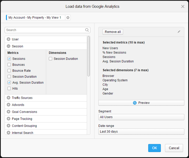 이 예에서는 My Account > My Property > My View 1에서 데이터를 로드합니다. 이 데이터는 Spotfire에 로드될 때 데이터 테이블이 됩니다. 대화 상자의 왼쪽에는 사용 가능한 지표와 치수가 범주로 나뉘어 표시됩니다. 이름이 세션인 범주가 확장되고 두 개의 지표 세션 및 평균 세션 기간이 선택되어 있습니다. 대화 상자의 오른쪽에는 선택된 모든 지표와 치수(이 경우에는 4개의 지표와 5개의 치수)가 나열됩니다. 각 지표 및 치수는 새 데이터 테이블의 컬럼이 됩니다. 컬럼의 이름을 바꾸려면 연필 아이콘을 클릭합니다. 대화 상자 오른쪽 아래에서는 세그먼트로 모든 사용자가, 날짜 범위로 지난 30일이 선택되어 있습니다.