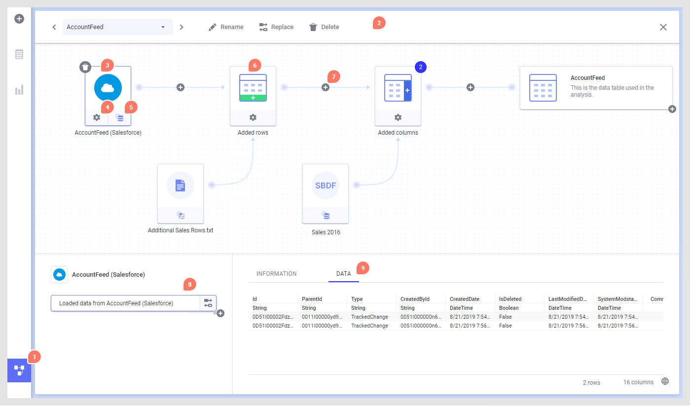 2. Панель инструментов в верхней части холста данных отображает название просматриваемой таблицы данных и содержит инструменты, которые работают со всей таблицей данных, такие как Переименовать, Заменить и Удалить.