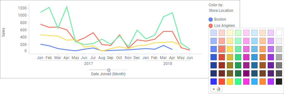 El eje Color por especifica la forma en que se aplica el color a los elementos de una visualización. Los colores se pueden cambiar fácilmente.
