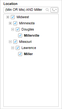 La estructura en árbol de un filtro jerárquico puede ser bastante extensa. Para buscar partes concretas de la jerarquías, puede escribir lo que esté buscando en el campo de búsqueda. Así encontrará los elementos de la estructura en árbol que empiecen por el texto que ha escrito.
