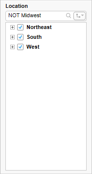 El siguiente ejemplo ilustra una búsqueda que usa el operador NOT. Se devolverán todas las ramas que no contengan elementos que empiecen por Midwest.