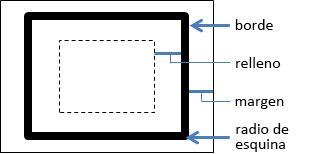 El contenido real de un objeto está delimitado por un borde. Dentro del área del borde, puede especificar el relleno, es decir, la anchura del espacio a cada lado del contenido. También puede configurar el color, la anchura y el radio de la esquina del borde. También se pueden configurar el margen que hay hasta los demás objetos de la interfaz de usuario.