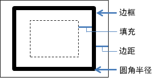 对象中的实际内容由边框包围。在此边框区域内,您可以指定填充,也就是内容每侧的空白边距。您也可以设置边框颜色、宽度和圆角半径。此外,用户界面中各对象之间的间距也可指定。