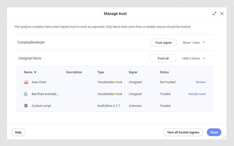 Spotfire 脚本和数据函数不支持签名,因此这些项目始终显示在“管理信任”对话框的“未签名项目”下。而 Spotfire 会使用一种信任机制,在这种机制中,通过许可证和组成员关系验证的名为“脚本作者”的用户是唯一能够使脚本受组织中的任何人信任的用户。