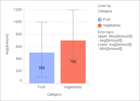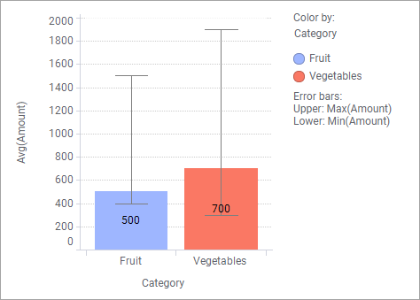 如果您有兴趣在条形图中呈现每种类别的平均销售量,以及通过误差线显示交易量变化的幅度,那么您需要一个自定义表达式进行误差线计算。如果您直接使用预定义的 Max() 和 Min() 聚合方法来获得如下所示的“交易量”列,则会错误地绘制出变化量。例如,水果的变化量应为 100-1000,而不是 400-1500。这是因为误差线始终是相对于标记绘制的,这意味着上限端帽等于平均销售量与最大销售量之和(例如,对于蔬菜为 700+1200)。