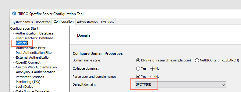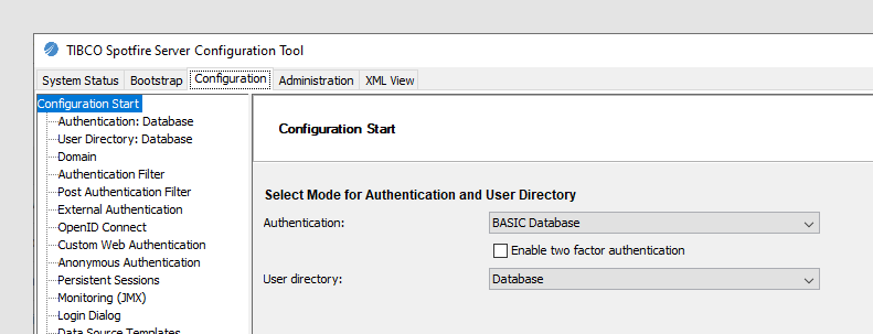 The Configuration page of the configuration tool shows the authentication type and the user directory for your installation. These instructions are for using the Spotfire database to authenticate users.