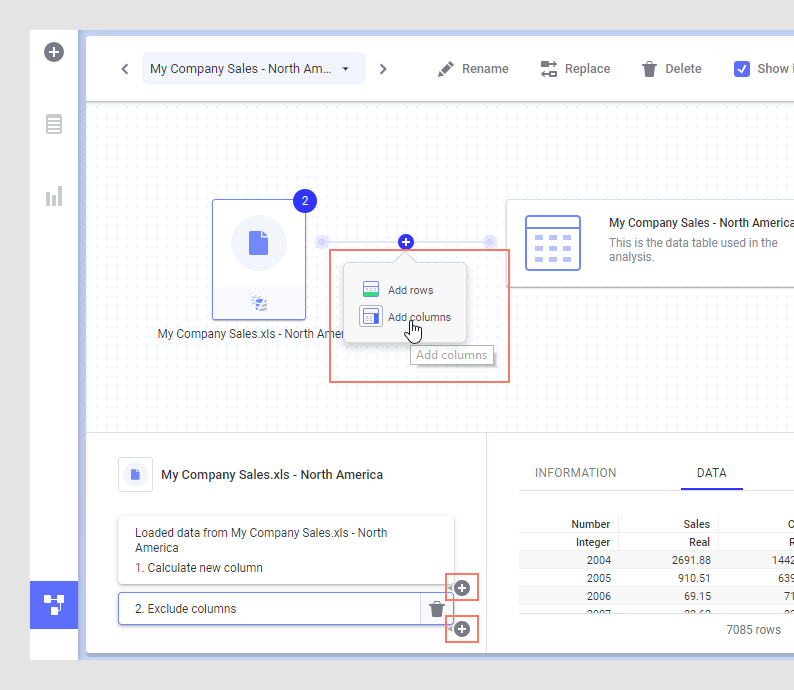 В этом примере данные уже были получены из локального файла Excel. На холсте данных выберите необходимую таблицу данных, определите, где требуется добавить столбцы (между узлами в графической структуре или между группами преобразований) и щелкните Добавить столбцы: