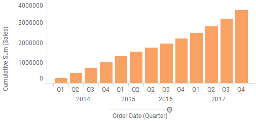 Dans cet exemple, vous souhaitez que la taille des barres des trimestres manquants soit la même que celle de la dernière barre disponible (plutôt qu'elles ne s'affichent pas). Pour ce faire, vous pouvez utiliser l’option Compenser les valeurs manquantes dans les propriétés de la visualisation. Cette fonctionnalité est disponible dans l’histogramme, la courbe de tendance, le graphique combiné (à partir du client installé uniquement), le diagramme en cascade et le diagramme de KPI. Elle introduit un mécanisme de compensation qui insère provisoirement des valeurs vides pour les lignes manquantes. Ainsi, la somme cumulée peut afficher la même valeur que la dernière barre disponible pour les barres avec des données manquantes :