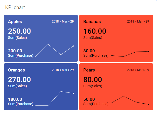 Supposons que vous voulez surveiller les dernières performances commerciales au regard des chiffres absolus des ventes et des achats par jour et par type de fruitsVous souhaitez également être alerté sur les chiffres de vente inférieurs à 200 par jour.
