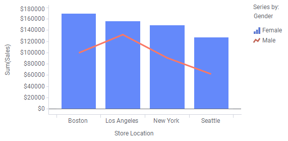 Le graphique combiné suivant montre les paramètres définis pour afficher les ventes réalisées par les femmes et par les hommes.