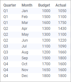 Vous pouvez voir ci-dessous les paramètres définis pour comparer les chiffres réels et les chiffres estimés du budget. Il est facile d'identifier les écarts. Par exemple, un dépassement considérable du budget s'est produit au cours du troisième trimestre.