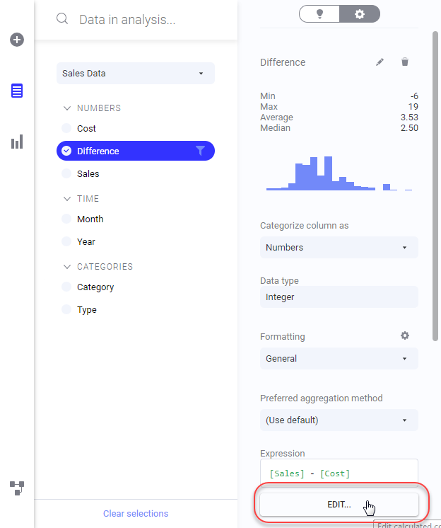 Lorsque vous avez créé une colonne calculée, vous pouvez la modifier dans le menu volant développé Données dans l'analyse ou dans Canevas de données.