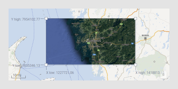 Les images dans les couches d'image peuvent être déplacées et redimensionnées directement dans la cartographie. La possibilité de déplacer des images peut être utile lorsque, comme illustré ci-dessous, vous voulez positionner une photo satellite au-dessus d'une couche de cartes ordinaire ou lorsque vous avez plusieurs images à organiser au-dessus d'une carte.