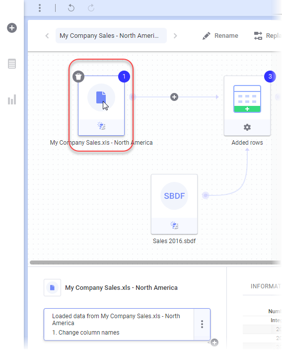 Lorsque vous remplacez une source de données (par exemple, une source de données fichier local par un fichier source de la bibliothèque), le comportement du chargement des données est défini sur le paramètre par défaut du type de source sélectionné. Dans la plupart des cas, le comportement du chargement des données peut être modifié en cliquant sur la partie inférieure du nœud source dans la vue de la source, si la nouvelle valeur par défaut n'est pas appropriée.