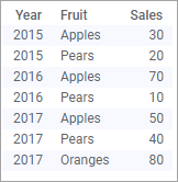 L'image suivante montre comment la répartition des données peut être représentée dans une visualisation ou un tableau croisé. Il n'y a pas de division en années : les valeurs des cellules du tableau croisé sont agrégées sur des parties qui comprennent toutes les années.