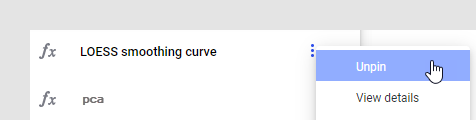 Le menu volant f(x) est utilisé pour fournir un accès facile aux fonctions de données couramment utilisées.En tant qu'auteur d'entreprise doté de la fonctionnalité de licence Épingler les fonctions de données et Menu volant f(x) (sous TIBCO Spotfire Advanced Analytics), vous pouvez épingler ou détacher votre propre sélection de fonctions de données de la bibliothèque au/du menu volant.Un administrateur peut prédéfinir des fonctions de données sélectionnées à l'aide d'une préférence.